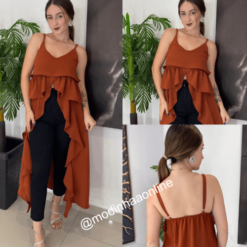 Blusa/bata tecido duna de ótima qualidade, não possui bojo, possui alça com regulagem de altura, comprimento assimétrico, com camadas de babados,