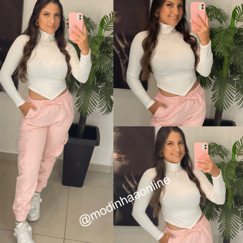 Blusa cropped canelada (varia conforme altura do tronco de cada pessoa), acabamento em ponta (V) na parte frontal, disponível modelo e cor conforme imagem.