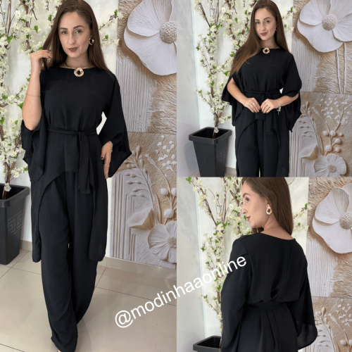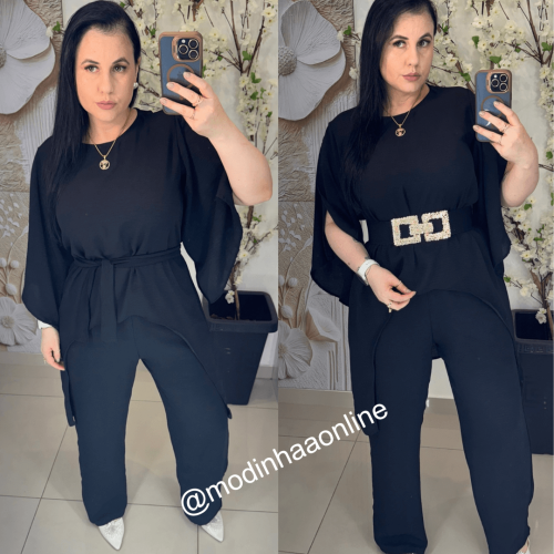 Calça : Possui elástico na cintura da peça, bolsos laterais, modelo pantalona, acompanha cinto do mesmo tecido da peça;(NÃO ACOMPANHA CINTO DA IMAGEM)