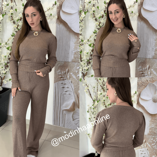 Blusa : Com manga, no tricô modal trabalhado, detalhes em botões nas mangas, comprimento varia conforme altura do tronco de cada pessoa,