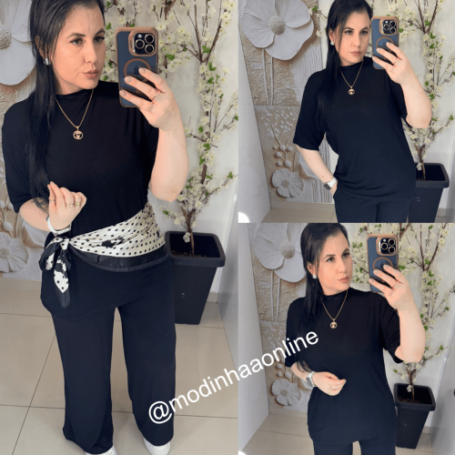 Calça: comprimento longo (variando conforme altura de cada pessoa), modelo flare (barra mais ampla)possui cós com elástico, possui bolsos laterais, look de ampla versatilidade; Possui elasticidade; Medidas feitas com a peça fora do corpo; NÃO ACOMPANHA LENÇO