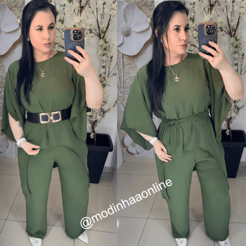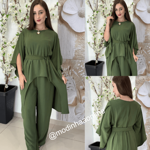 Calça : Possui elástico na cintura da peça, bolsos laterais, modelo pantalona, acompanha cinto do mesmo tecido da peça;(NÃO ACOMPANHA CINTO DA IMAGEM)
