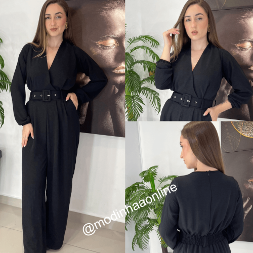 Em tecido Duna de alta qualidade (não amassa e não encolhe), manga longa com elástico no punho, possui lastéc na parte das costas (cintura), decote em V (transpassado), fechamento em zíper na parte das costas, calça modelo pantalona, acompanha cinto na mesma cor da peça, comprimento ira variar conforme altura de cada pessoa, geralmente será longo;