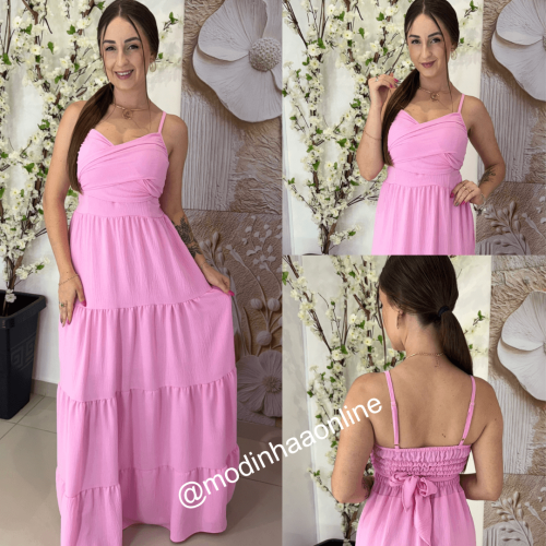 Vestido no tecido duna (não encolhe e não amassa) possui elástico (camada de lastéc) na cintura (parte das costas) possui bojo , alças com regulagem de altura, não possui transparência, detalhes de amarração na parte do busto, modelagem de saia 4 marias (4 camadas de babados) possui ótimo caimento, ótimo para ser usado em várias estações e ocasiões, comprimento ira variar conforme altura de cada pessoa, geralmente será longo;
