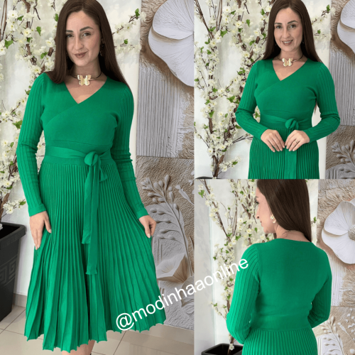 Possui elasticidade; parte de baixo (saia) plissada mais rodada , parte de cima (blusa) decote em V transpassado, detalhe de sinto anexo a peça; DISPONIVEL NO MODELO E COR DA IMAGEM