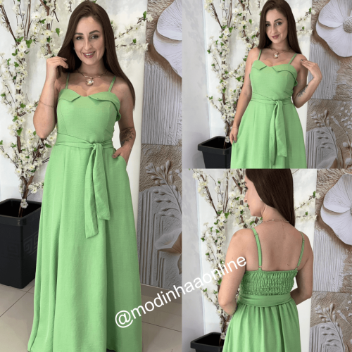 Vestido no tecido duna linho (não encolhe e não amassa) possui elástico (camada de lastéc) na cintura (parte das costas) possui bojo , alças com regulagem de altura, não possui transparência, possui ótimo caimento, ótimo para ser usado em várias estações e ocasiões, comprimento ira variar conforme altura de cada pessoa, geralmente será longo;