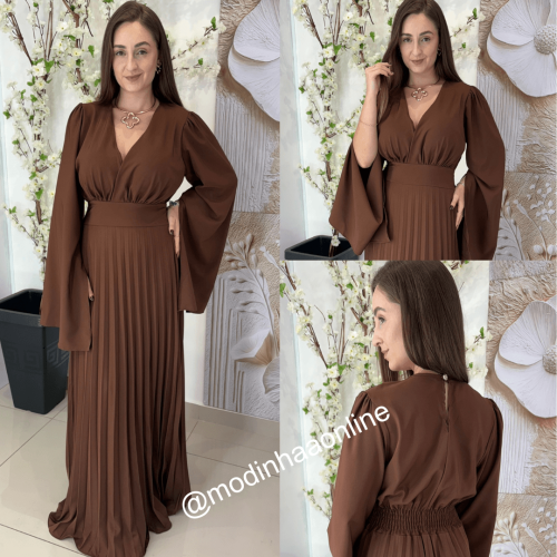 Vestido no tecido crepe premium (não encolhe e não amassa), modelo plissado com manga, possui elástico (camada de lastéc) na cintura (parte das costas) possui bojo, decote em V, detalhe de aberturas nas mangas, não possui transparência, possui ótimo caimento, ótimo para ser usado em várias estações e ocasiões, comprimento ira variar conforme altura de cada pessoa, geralmente será longo;
