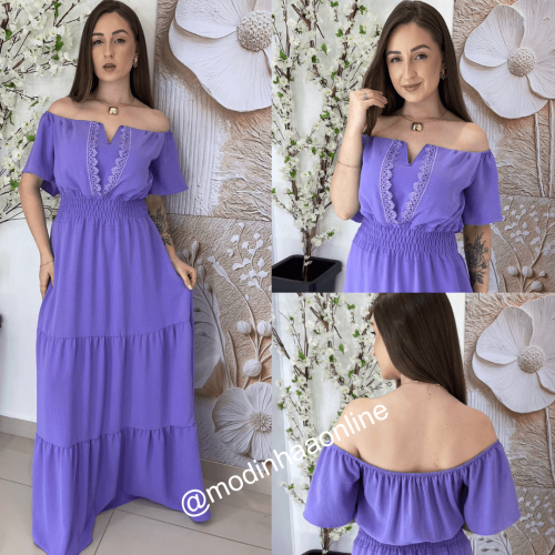 Vestido no tecido crepe (não encolhe e não amassa) possui elástico na cintura (camada de lastéc), manga ciganinha onde você pode estar usando de forma tradicional ou ombro a ombro, não possui bojo , não possui transparência, parte da saia em babados 3 marias (três camadas de babados) possui ótimo caimento, ótimo para ser usado em várias estações e ocasiões, comprimento ira variar conforme altura de cada pessoa, geralmente será longo;